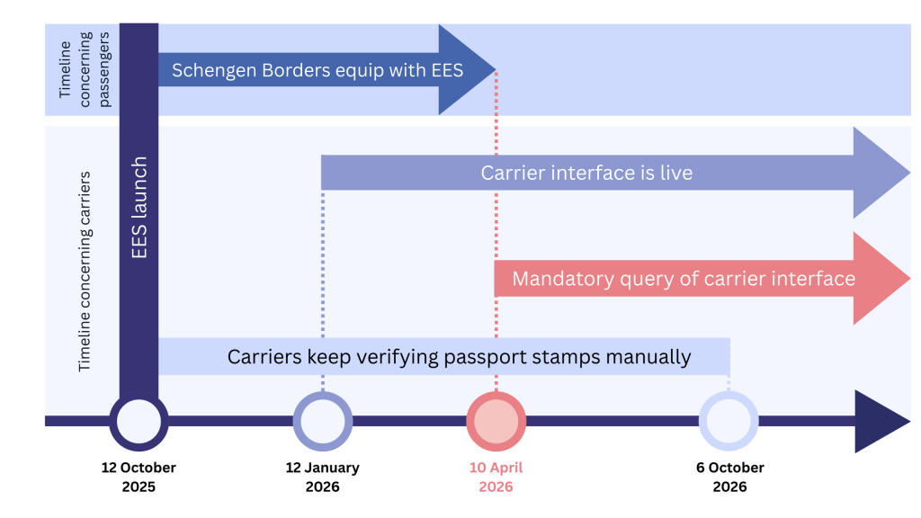 - October 12, 2025: The EES rollout begins. Collection of biometric data of non-Schengen/non-EU passengers at border crossing points starts — this process will be progressively rolled out to cover all the external borders by April 9, 2026. There are no carrier obligations at this stage.